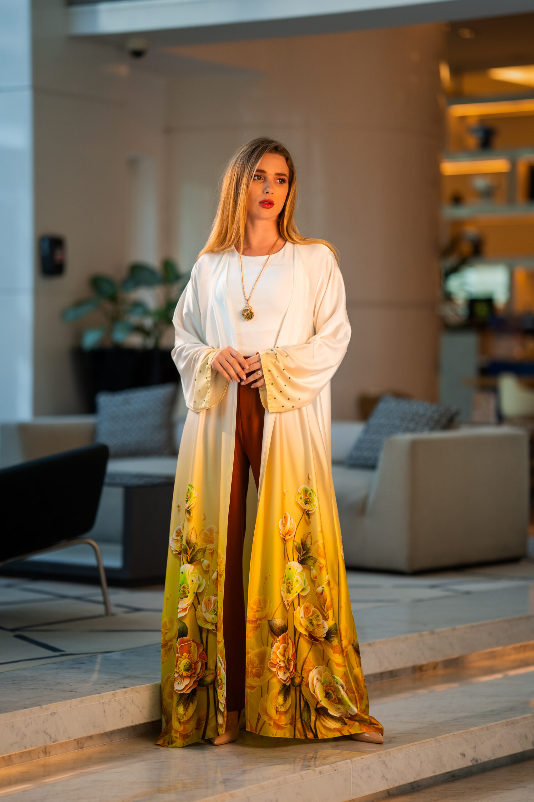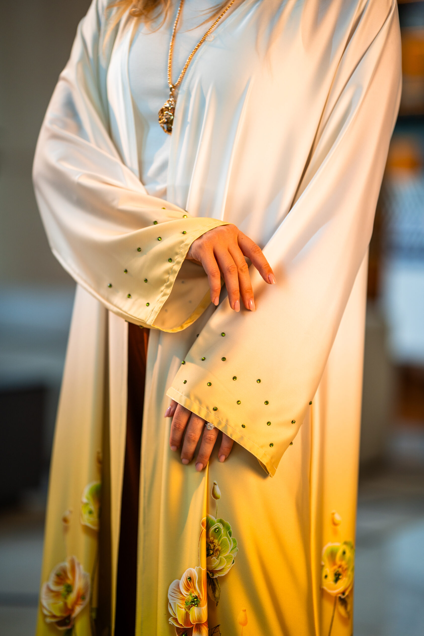 Flowery spring abaya design with high quality shiny colorful rhinestones. Comes with Maxi Dress, perfect for gathering, Ramadan and Eid celebrations. it is made from high quality fabric that has soft and luxurious feel. it is lightweight and wrinkle-resistant.